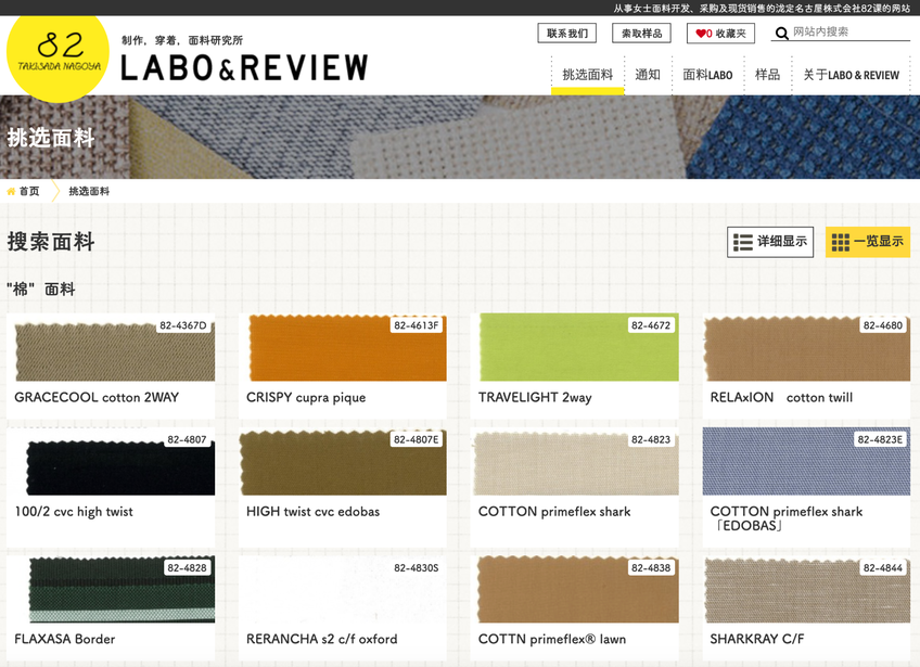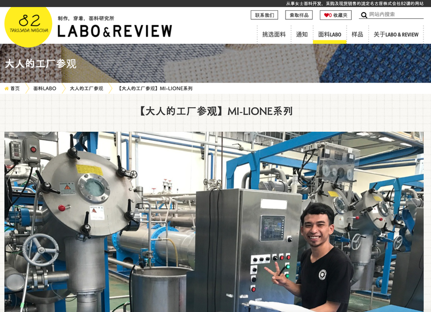 201704/10 LABO & REVIEW公开 由泷定名古屋株式会社82课运营的时尚面料信息网站《LABO & REVIEW》已公开。 搜索面料 可搜索并查看由泷定名古屋株式会社82课开发及采购的原创面料的详细信息。如果发现感兴趣的面料,您可以索取样品资料,直接确认面料手感及色调。 面料特长及产地介绍 可供作挑选面料参考的“面料研究所”。希望通过对产地、工厂,以及穿着感、功能性、保养方法的介绍,使顾客更多地了解和利用我们的面料。 产品介绍、顾客之声、员工介绍 对使用面料制成的产品、有关服装业的顾客之声,以及泷定名古屋株式会社82课的员工进行介绍。除了面料本身的内容,还登载涉及其环境、以及利益相关者的信息。