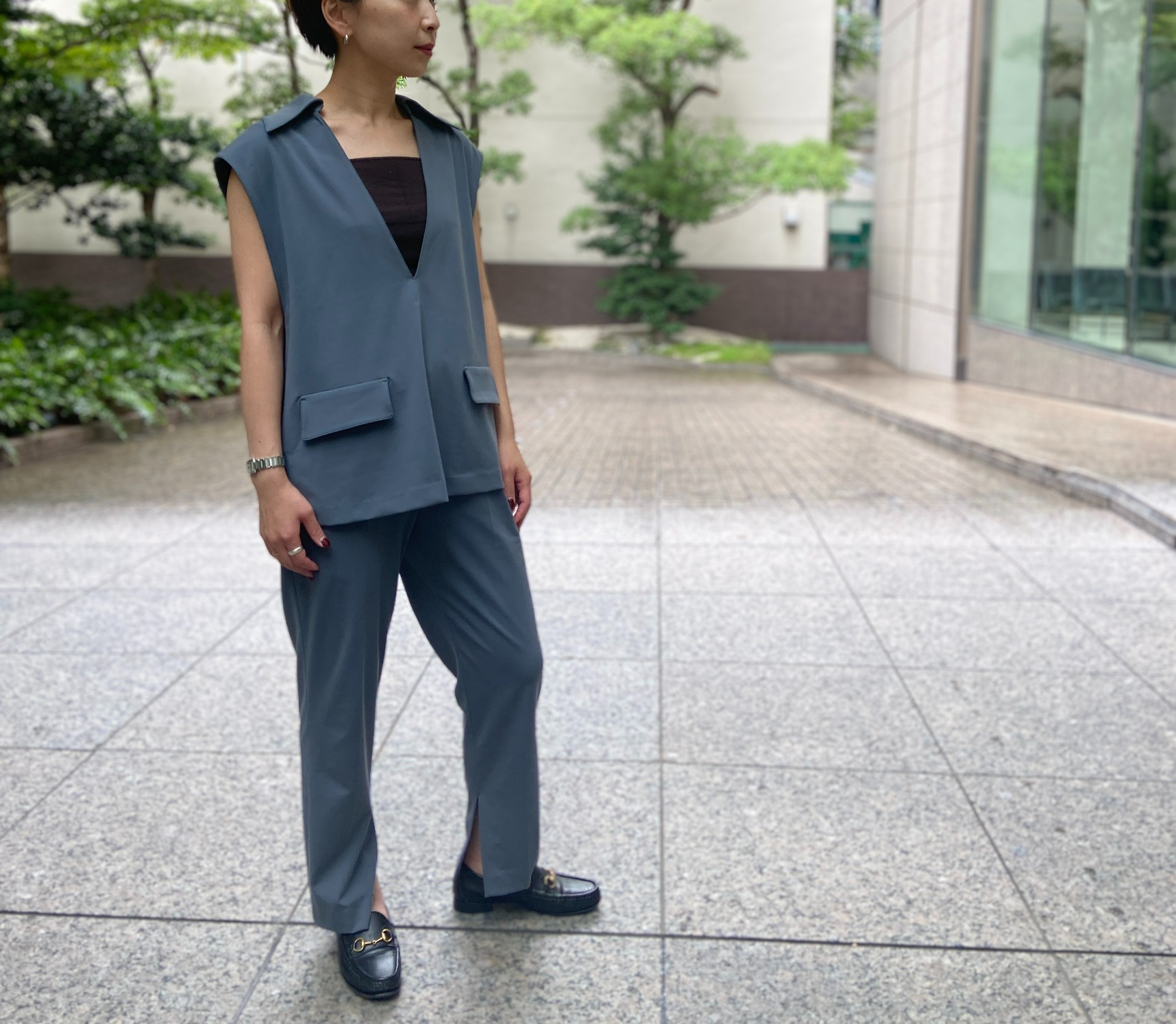 通勤にも、週末にも活躍しそうな、キレイ目でトレンド感のあるセットアップ。