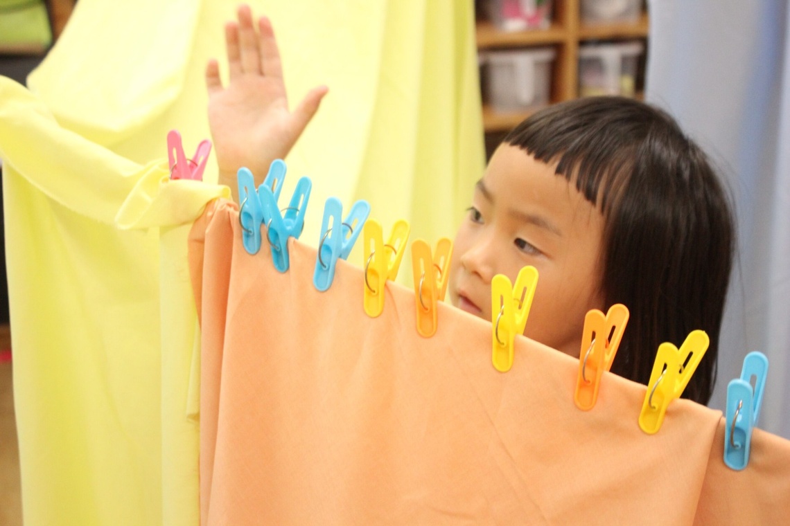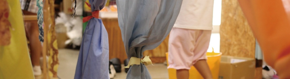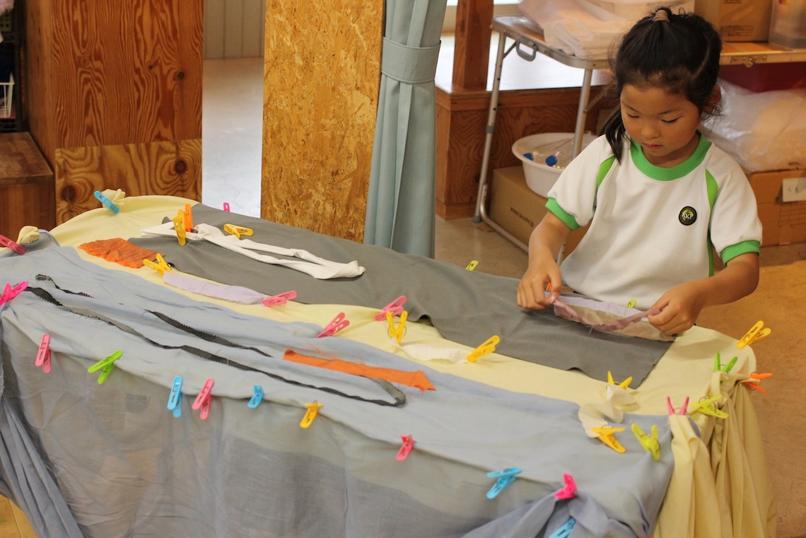 普段の生活に結び付いた生地(布)だからこそ生まれる、想像の世界。生地(布)と触れ合うこどもたちの豊かな表情は、私たちが望んだ以上のものでした。新聞紙や、粘土や、ビニールひもや、どんぐりのように生地ももっと気軽に、自由に、触り、遊び、身近に感じてほしい。