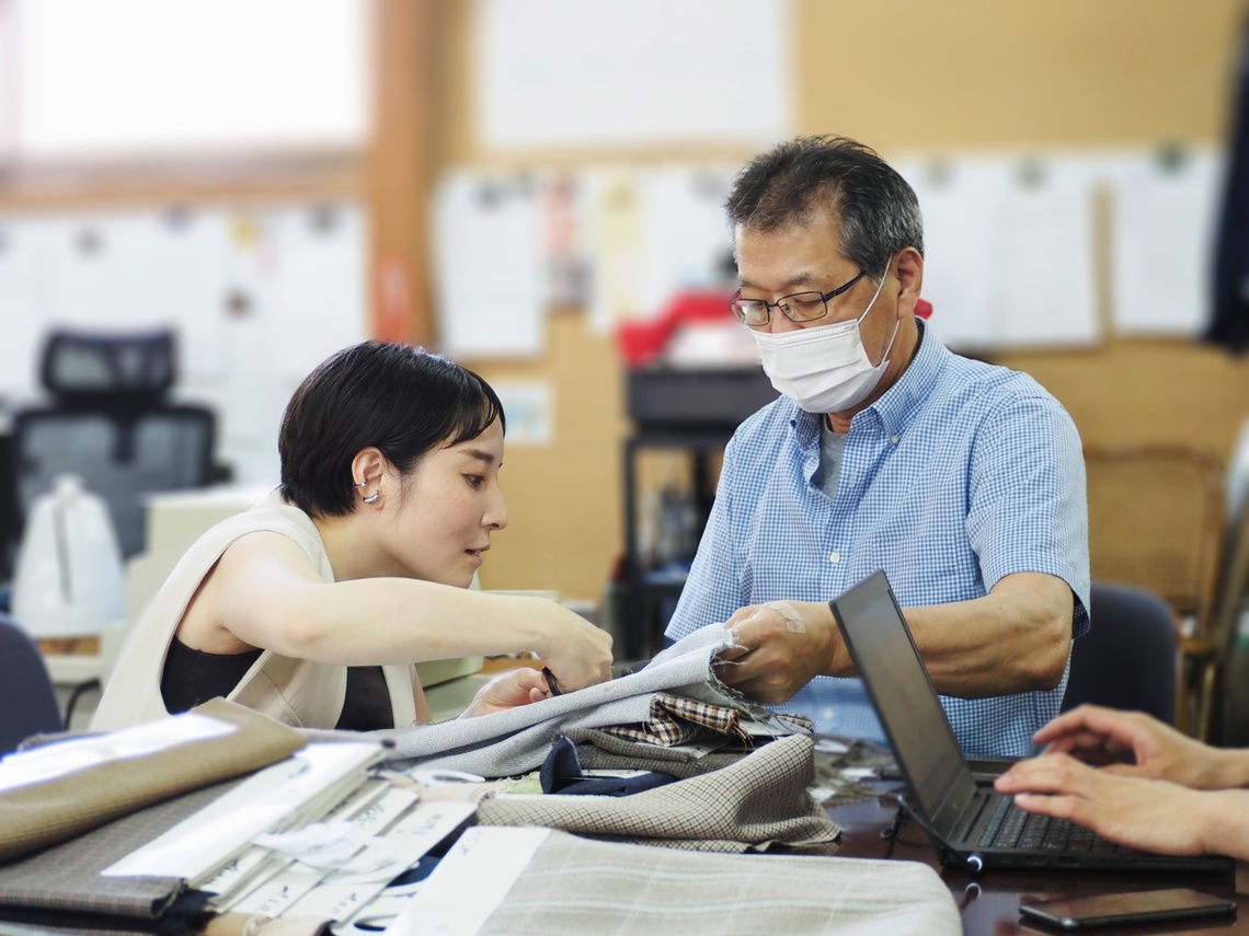 ツムギートは先染めのような複雑なカラーミックスを、後染めで表現しています。糸を染めてから織り上げ、整理をする先染めの産地は、職人さんの高齢化や原料のコストアップを理由に年々縮小し、クイックに生産することが難しくなっています。ツムギートは後染めで展開することで、必要な時に必要なだけ作ることが出来、買う側にも作る側にも優しい素材です。