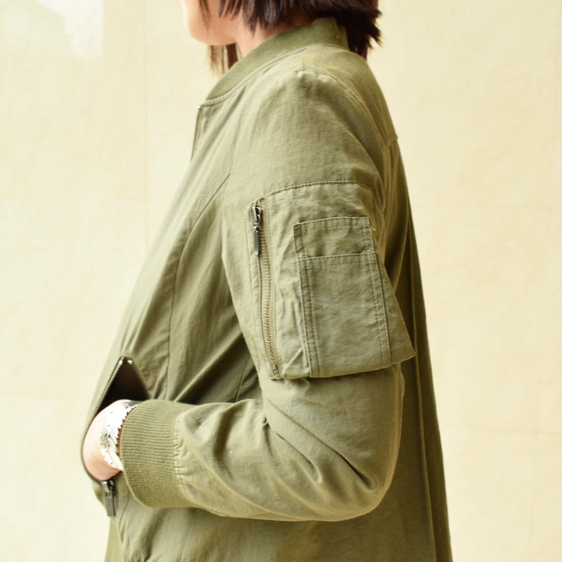 ドライタッチなナイロンにコットンを合わせた高密度素材。適度なハリ感で、軽量なアウターやフォルムを出したいスカートをイメージして作りました。タンブラー加工により繊維をリラックスさせ、ナイロン特有のしぼしぼ表情を付与しています。また製品でワンウォッシュすることにより、さらにカジュアル感をUPすることも可能です。