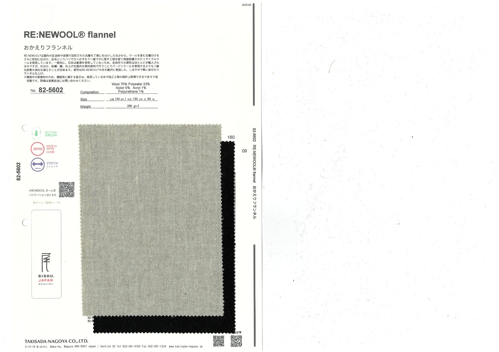 RE:NEWOOL®は国内の自治体や店頭で回収された古着を丁寧に仕分けしたなかから、ウールを含む古着だけをさらに色別に仕分け、反毛というハリでひっかきもう一度ワタに戻す工程を経て再度紡績されたリサイクルウールを使用しています。一般的に、日本は資源を保有していないため、生地作りの原料はほとんどが輸入されるのですが、仕分け、紡績、織、仕上げを国内の尾州産地で行うことでバージンウールを使用するよりも二酸化炭素の排出を減らすことが出来ます。新作はRE:NEWOOL®の糸を贅沢に使用した、しなやかで軽い目付のフランネル仕上げ。