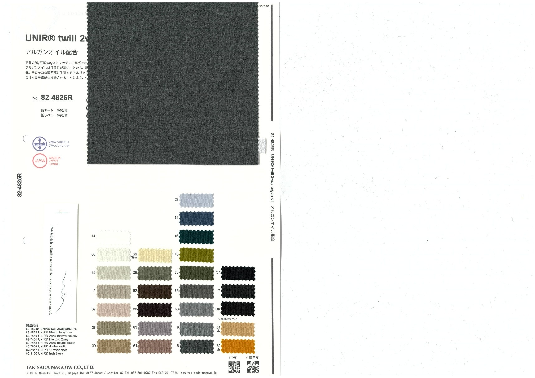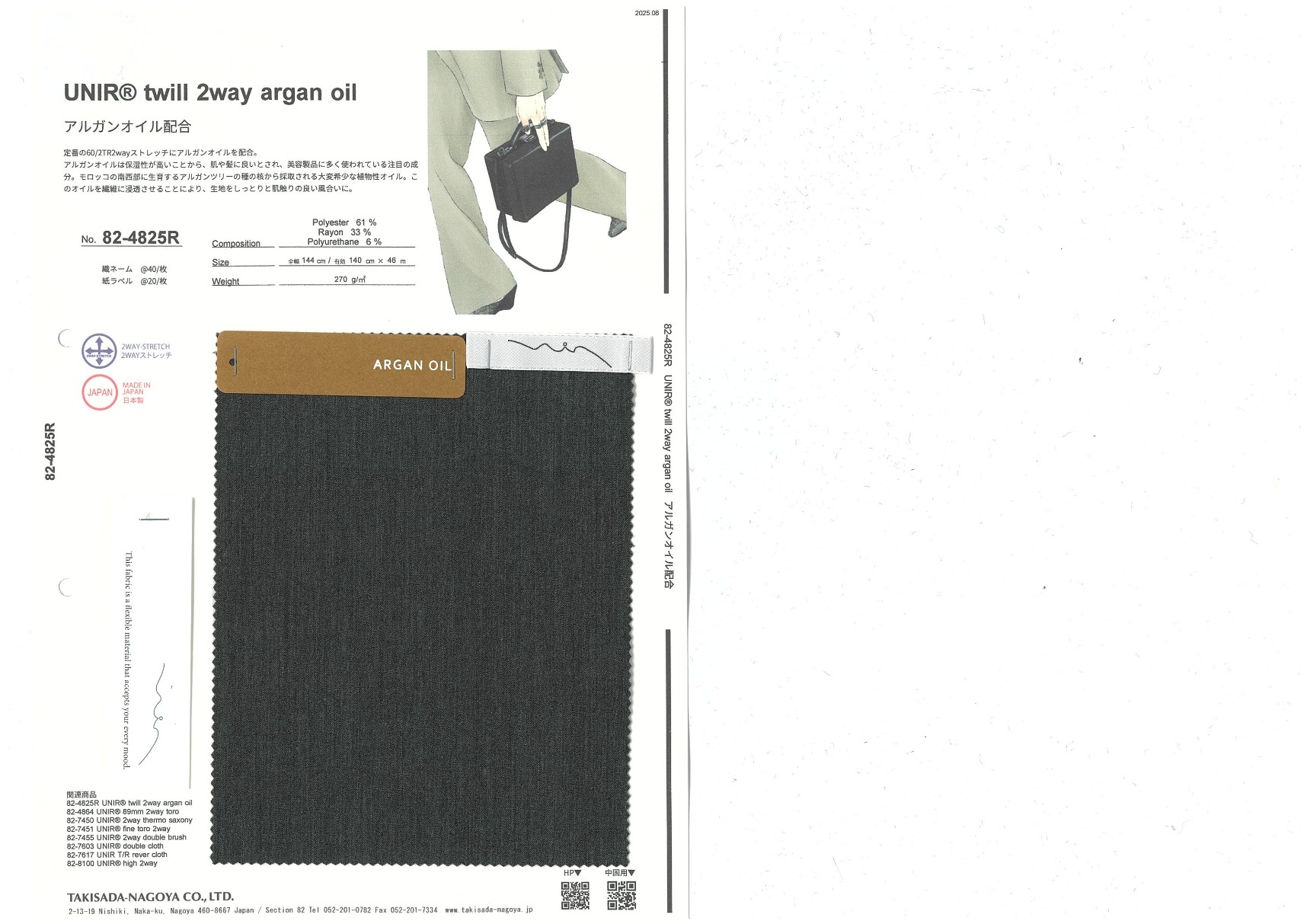 定番の60/2TR2wayストレッチにアルガンオイルを配合。アルガンオイルは保湿性が高いことから、肌や髪に良いとされ、美容製品に多く使われている注目の成分。モロッコの南西部に生育するアルガンツリーの種の核から採取される大変希少な植物性オイル。このオイルを繊維に浸透させることにより、生地をしっとりと肌触りの良い風合いに。