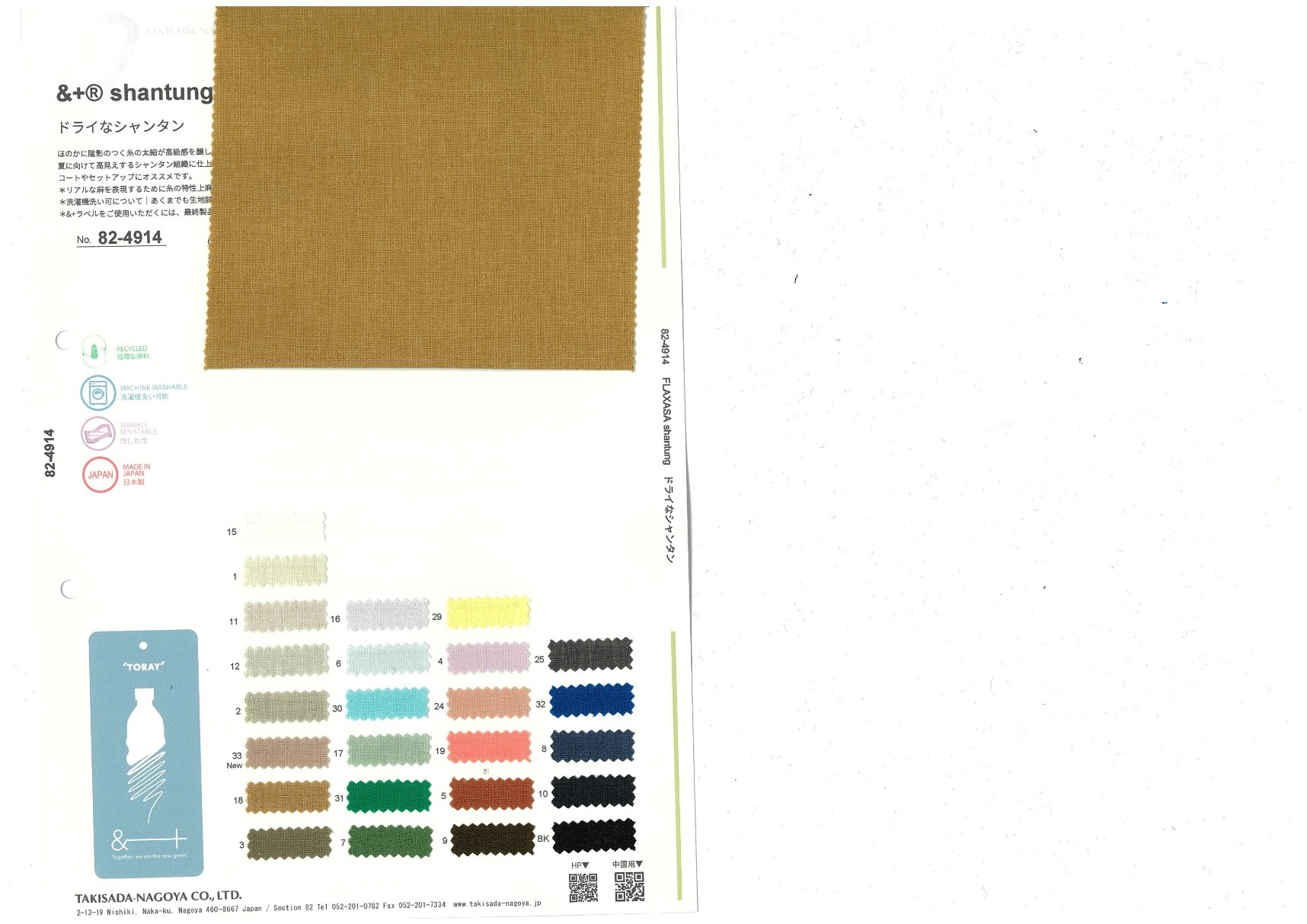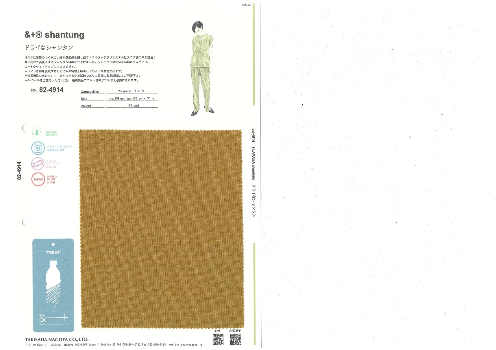 ほのかに陰影のつく糸の太細が高級感を醸し出すドライタッチポリエステルRELA×ION®-Hi。なんと、その糸にスラブ調の糸が誕生!夏に向けて高見えするシャンタン組織に仕上げました。少しエッジの効いた麻調が玄人感アリ。コートやセットアップにオススメです。静電防止の糸使用。