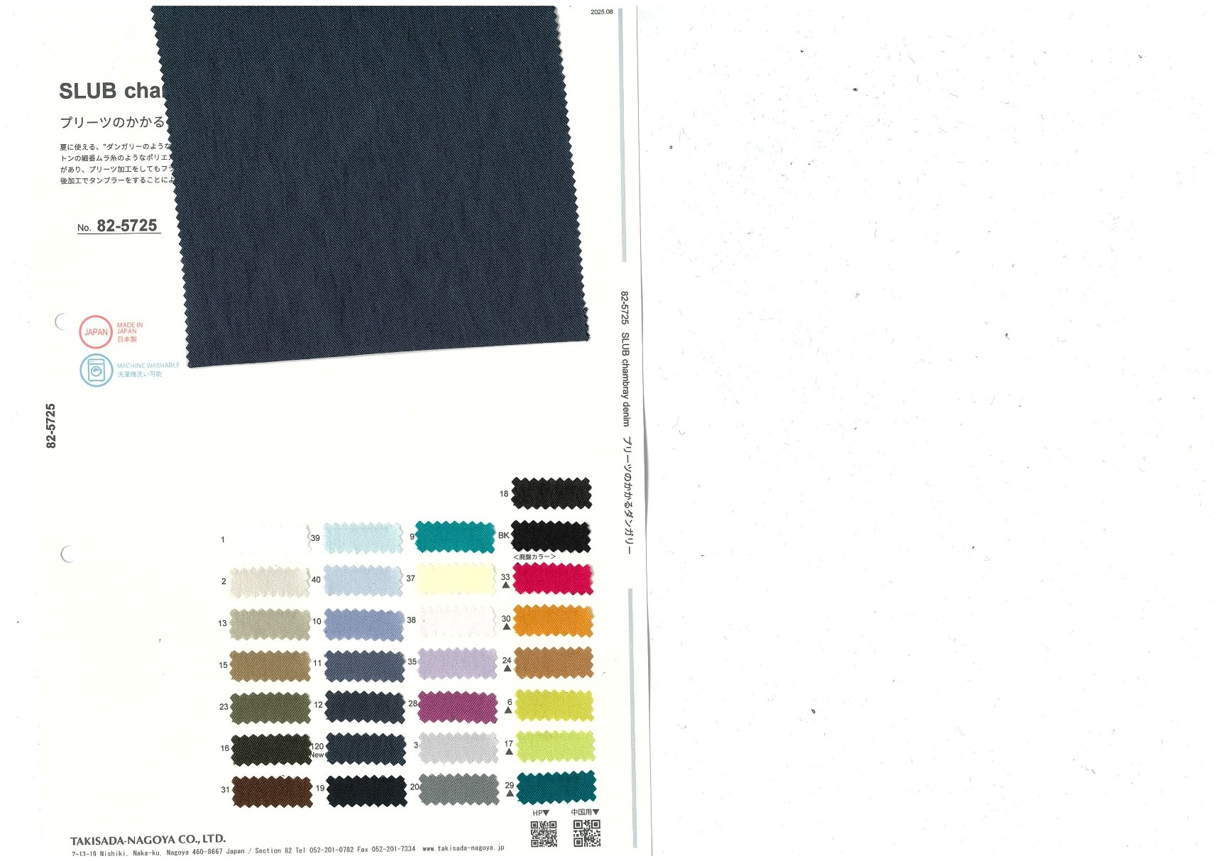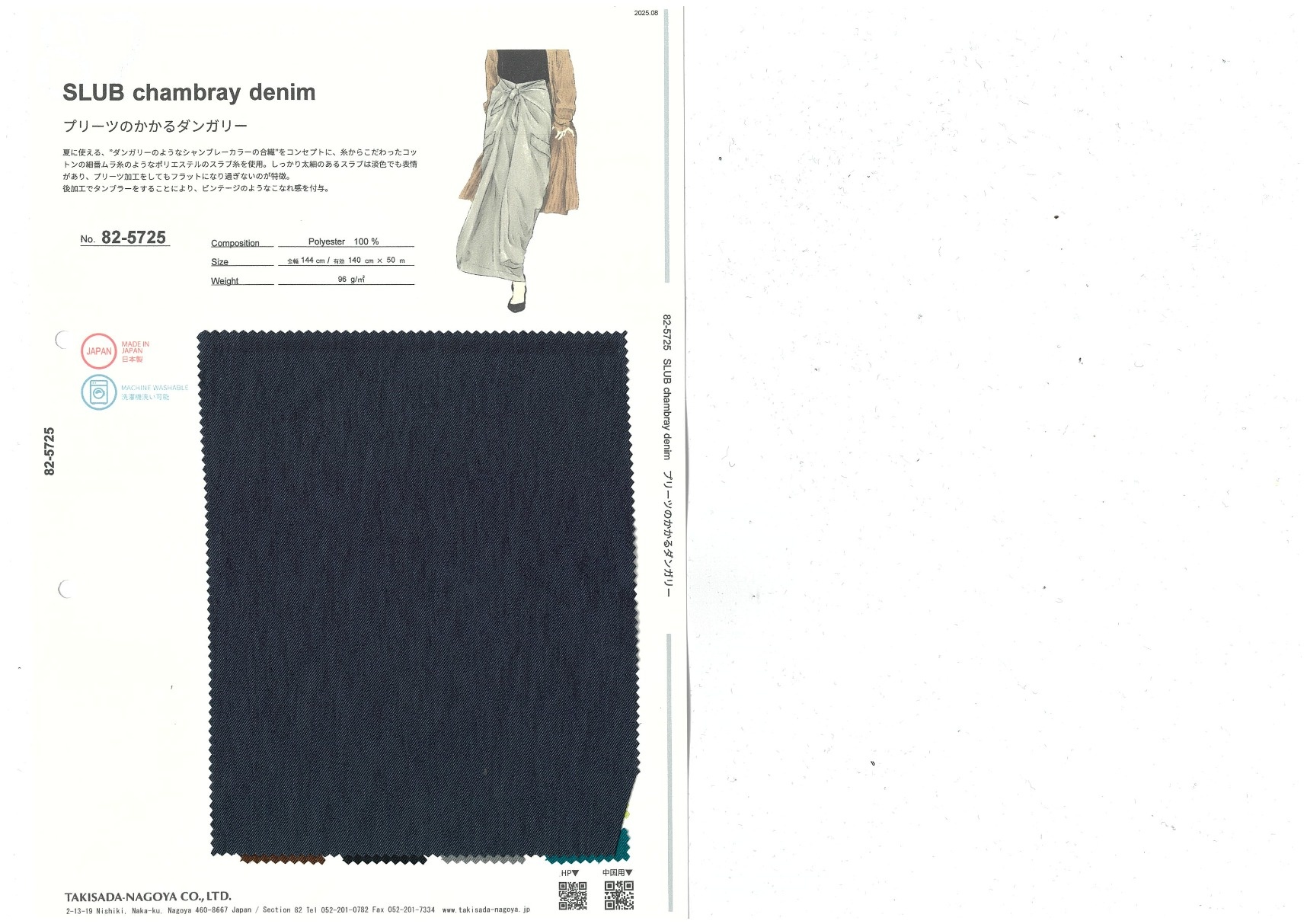 夏に使える、ダンガリーのようなシャンブレーカラーの合繊をコンセプトに、糸からこだわったコットンの細番ムラ糸のようなポリエステルのスラブ糸を使用。しっかり太細のあるスラブは淡色でも表情があり、プリーツ加工をしてもフラットになり過ぎないのが特徴。後加工でタンブラーをすることにより、ビンテージのようなこなれ感を付与。