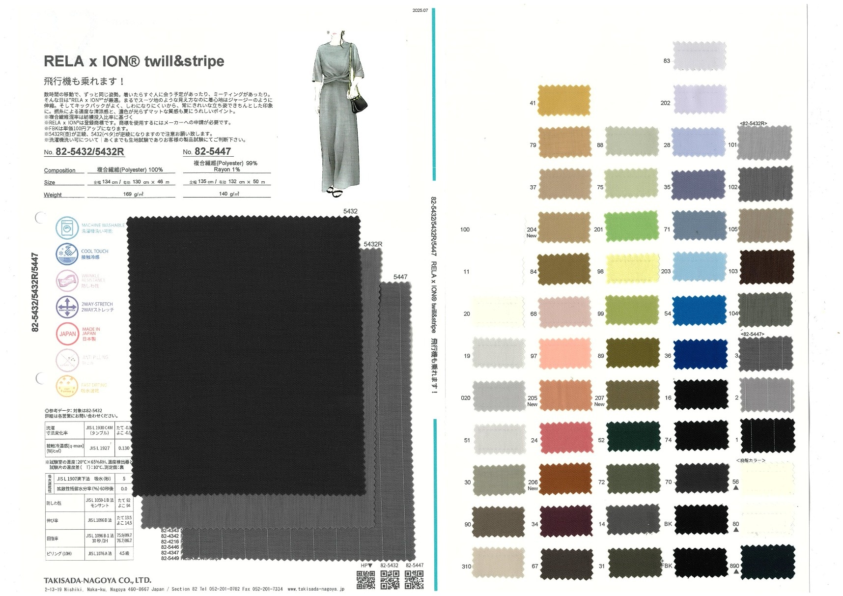 数時間の移動で、ずっと同じ姿勢。着いたらすぐ人に会う予定があったり、ミーティングがあったり。そんな日は”RELA x ION®”が最適。まるでスーツ地のような見え方なのに着心地はジャージーのように伸縮。そしてキックバックがよく、しわになりにくいから、常にきれいな立ち姿できちんとした印象に。撚糸による適度な清涼感と、濃色が光らずマットな質感も夏にうれしいポイント。※複合繊維混率は紡績投入比率に基づく ※RELA x ION®は登録商標です。商標を使用するにはメーカーへの申請が必要です。*FBKは単価100円アップになります。5432R(杢)が正綾、5432(ベタ)が逆綾になりますので注意お願い致します。*洗濯機洗い可について:あくまでも生地試験でありお客様の製品試験にてご判断下さい