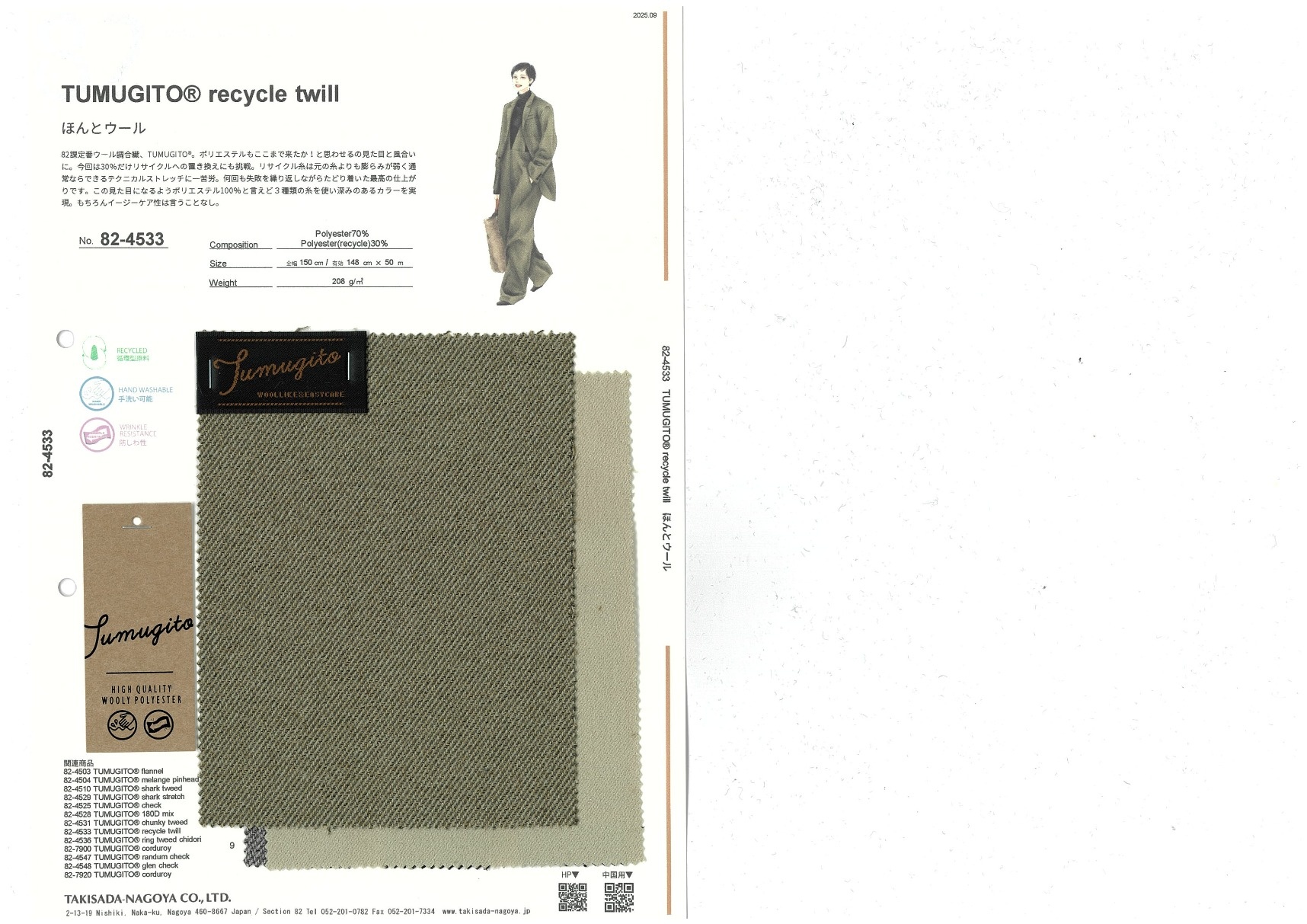 82課定番ウール調合繊、TUMUGITO®。ポリエステルもここまで来たか!と思わせるの見た目と風合いに。今回は30%だけリサイクルへの置き換えにも挑戦。リサイクル糸は元の糸よりも膨らみが弱く通常ならできるテクニカルストレッチに一苦労。何回も失敗を繰り返しながらたどり着いた最高の仕上がりです。この見た目になるようポリエステル100%と言えど3種類の糸を使い深みのあるカラーを実現。もちろんイージーケア性は言うことなし。